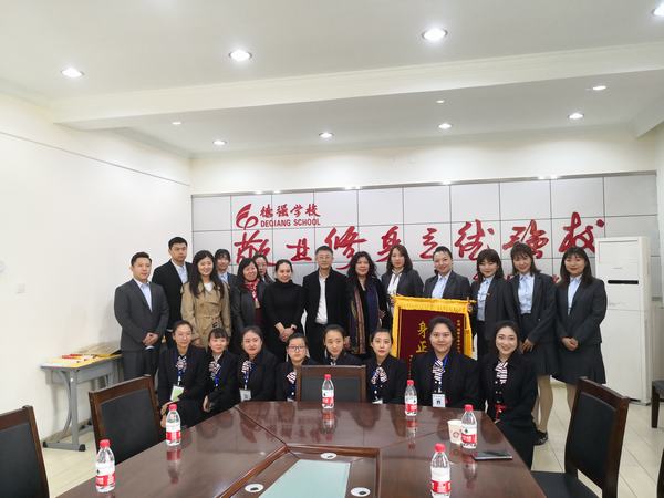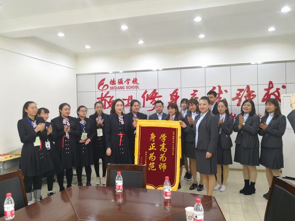 会议结束后,我校一行6人来到德强小学部的会议室与音乐组的实习导师交流学生的实习情况,德强小学部音乐组组长曲静说,本次来到德强小学实习的学生都非常刻苦并表示会毫无保留的教导孩子们。我校音乐教育专业全体学生将写有“学高为师,身正为范”的锦旗送到德强小学导师手中来表达对导师的感谢。
