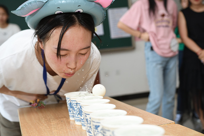 在“幸运挑战环节”,学生开始十分紧张,后来发现每个人都可以通过自己的“运气”在紧张和激动中就顺利过关;在“画画传递猜词”环节,考验的是学生的发散思维能力;在“吹乒乓球”环节,学生需要有充足的“底气”和掌控它的能力方可通过;在“指压板上的智慧”需要学生学会坚持与配合;最后的“大家一起跳”环节,事实上是让同学们感受团队及放松的过程。