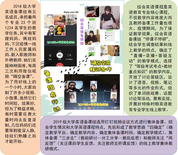 为更好地完成线上教学任务,英语教育系的教师们参加多个教学平台的培训,做好充分的授课准备,自3月2日线上教学正式运行,十五名教师已经顺利完成了三周的线上教学任务,为保证教学的质量和效果,系部加强管理沟通,备课组团队聚力,教师克服重重困难,用实际行动彰显了疫情之下教师的责任与担当。