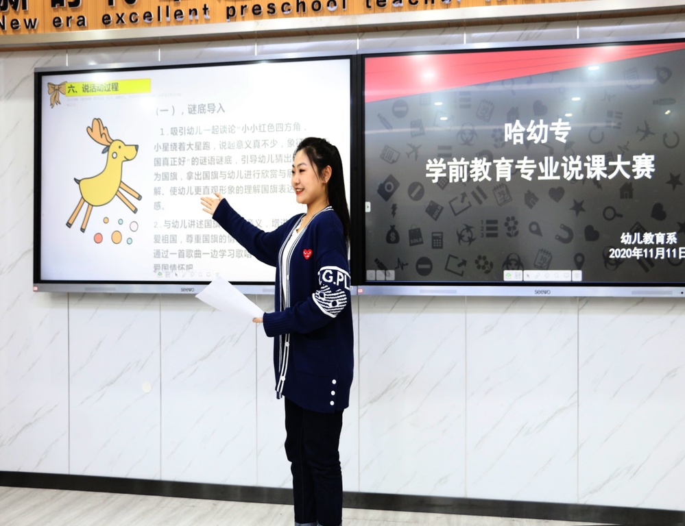 为进一步增强幼儿教育系学生实践应用能力和创新能力,彰显师范特色,强化学生教学技能。幼儿教育系教法教研室于2020年11月11日下午1点组织18级学生参加幼儿园说课大赛,从教师口语、教态、授课内容设计、重难点把握、教法学法、多媒体使用、板书设计等方面对选手进行综合考核。各参赛选手说课材料准备充分,课堂教学目的明确,教学思路清晰,教学过程设计合理,语言表达准确精炼,教学方法独特新颖。参赛选手不仅将书面的教学方案说出来,还将隐含于教育方案后面的设计思想、教育理念、具体依据和教学流程都清晰地表达出来,学生教学技能得到不同程度的提高,也为今后参加省赛、国赛做好充分准备。