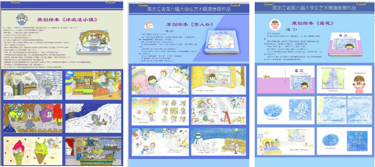 在绘本类作品中,许大梅、邢琳老师指导的原创冰雪儿童绘本《雪花》获一等奖,原创冰雪儿童绘本《霜花》《冰激凌小镇》获二等奖,原创冰雪儿童绘本《冬天里最温暖的歌》《雪人谷》获三等奖。许大梅老师指导的原创疫情儿童教育绘本《小小蝙蝠有话说》获二等奖,原创疫情儿童教育绘本《感恩天使》获三等奖。纪红老师指导的《花季》获三等奖。绘本汇集媒材之美、艺术之美、叙事之美于一身,恰似一种多维度艺术创造。原创儿童绘本创作是我校美术教研室工作坊建设特色课程。