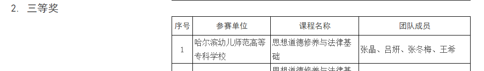 2020年9月,根据《省教育厅关于举办2020年黑龙江省职业院校技能大赛教学能力比赛暨国赛选拔赛的通知》的要求,哈尔滨幼儿师范高等专科学校思政教学部组建高职组《思想道德修养与法律基础》课团队,由张晶带队,吕妍、张冬梅、王希积极进行课程和材料准备,在黑龙江省职业院校技能大赛教学能力比赛338件参赛作品中获得省三等奖的优异成绩。