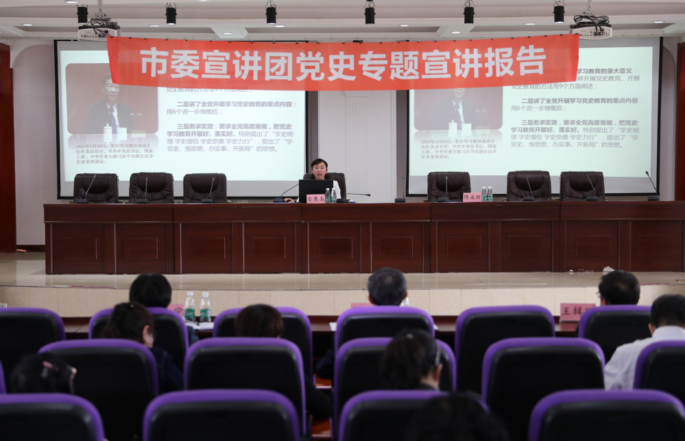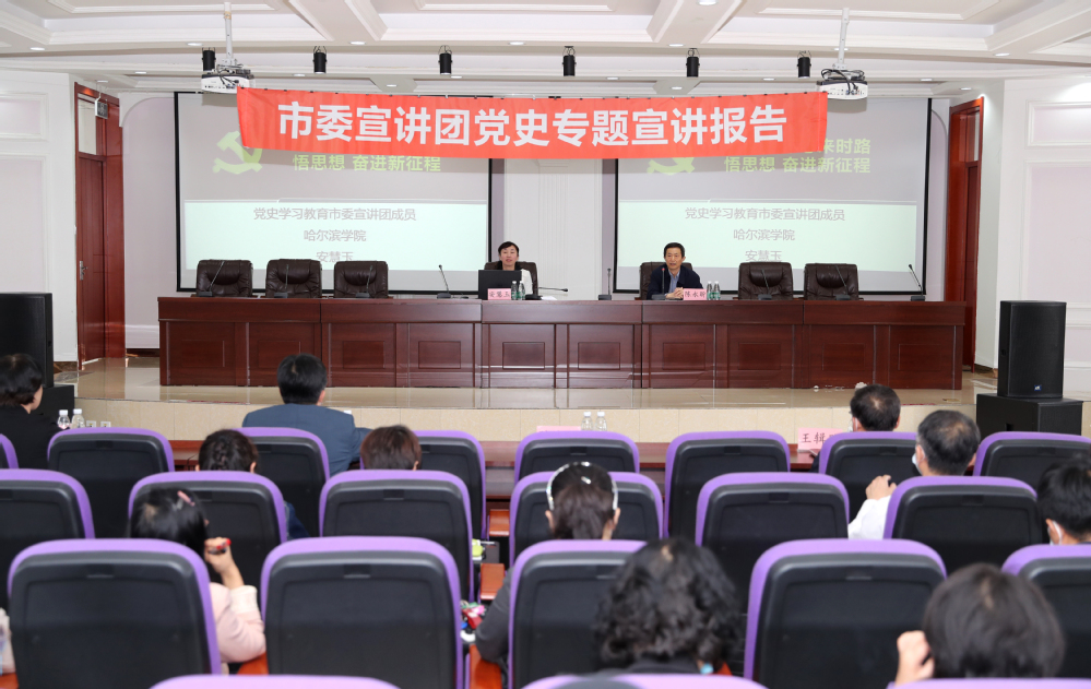 为推动党史学习教育深入开展,教育引导广大党员干部、青年学生从百年党史中汲取营养和力量,切实做到“学党史、悟思想、办实事、开新局”,5月14日下午,我校邀请市委宣讲团成员,哈尔滨学院马克思主义学院、形势与政策教研室主任、思想政治理论课实践教学管理办公室主任安慧玉教授来校作党史学习教育专题宣讲报告。