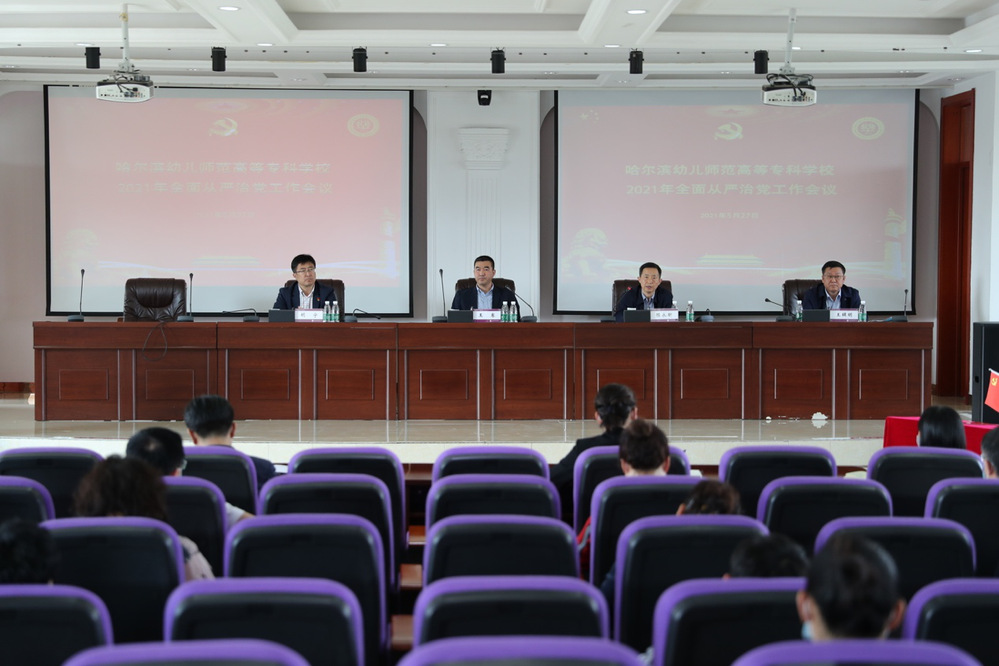 5月27日下午,哈幼专2021年度全面从严治党工作会议召开,纪委书记、监察专员王辑明传达了2021年全省教育系统全面从严治党工作视频会议精神,各分管领导、部门负责人分别签订了全面从严治党责任状,党委书记、校长王骞同志发表讲话。学校领导、处级干部、科级干部、学生工作处全体人员、团委全体人员与全体辅导员参加了会议。会议由党委副书记陈永昕主持。