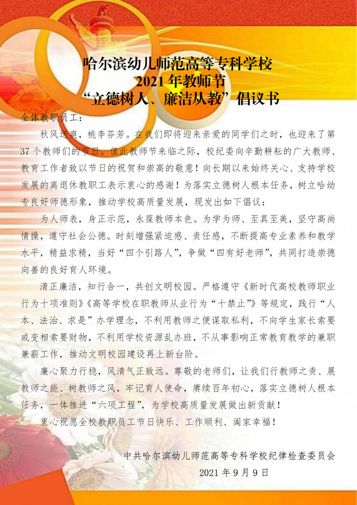 哈尔滨幼儿师范高等专科学校 2021年教师节“立德树人、廉洁从教”倡议书