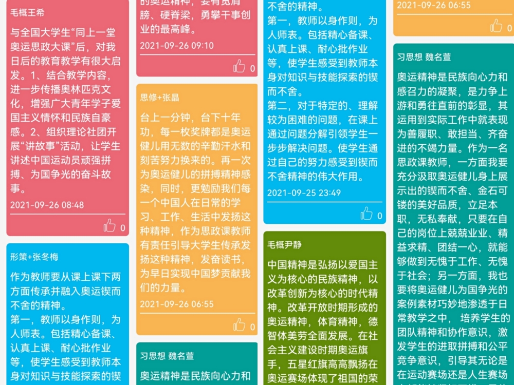 按照学校既定工作计划,2021年9月25-26日,我校思政教学部全体教师和学生共同以“学生”的身份直播或回看学习本次“同上一堂奥运思政大课”。本次哈幼专共有4589人收看并参与研讨“同上一堂奥运思政大课”活动。哈幼专思政教学部全体教师不仅对本次大课进行了课后研讨和心得交流,也通过云平台组织学生进行了集体讨论,师生反响热烈。学生们纷纷表示为进一步传播奥林匹克文化,增强广大青年学子爱国主义情怀和民族自豪感,我们要学习奥运健儿努力拼搏、锲而不舍的精神。传承中国精神,传递中国力量,将小我和大我结合起来,为中国特色社会主义事业贡献力量。