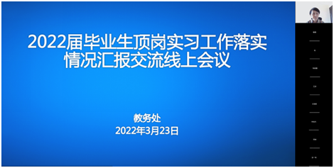 为了进一步贯彻黑龙江省教育厅《关于做好近期全省职业学校学生实习实训管理工作提示》的相关要求,规范学生实习管理工作,2022年3月23日下午通过腾讯会议软件召开了2022届毕业生顶岗实习工作落实情况汇报交流线上会议。会议由教务处处长杨薇主持,副校长于立新、各相关系部主任、实习管理负责人及部分辅导员参加此次会议。