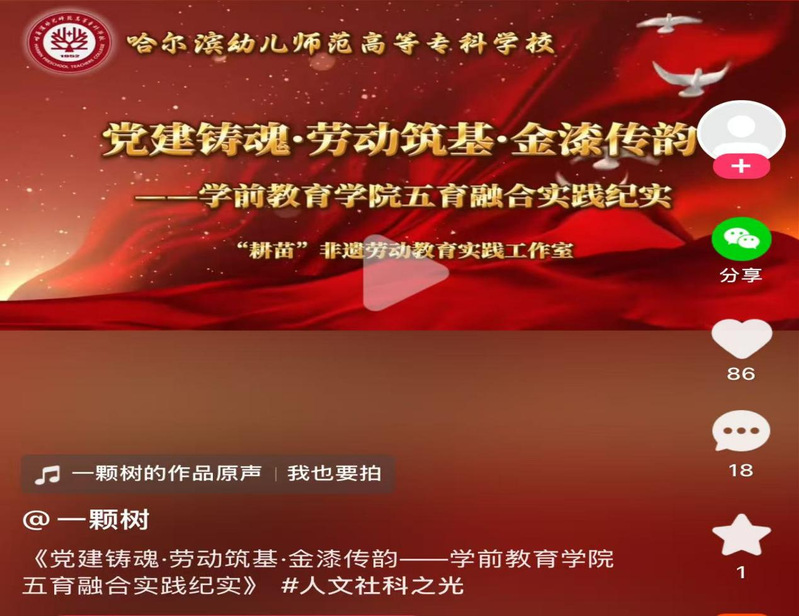 近日,由黑龙江省社科联主办第三届黑龙江省社科普及短视频大赛评选结果揭晓。我校选送的作品《党建铸魂 劳动筑基 金漆传韵——学前教育学院五育融合实践纪实》,经上级部门审读评审,荣获三等奖。这是我校第二次荣获此类奖项,充分展现了我校在社科普及工作中的持续努力与良好成效。