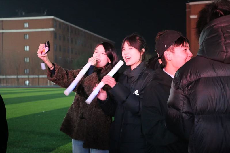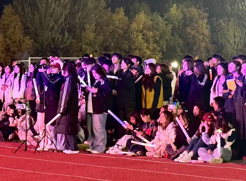 活动当天,不少同学难掩兴奋早早来到现场,领取荧光棒和头饰的区域排起长队,台下观众热情洋溢地挥舞手中的荧光棒,期盼活动开始。
