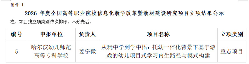 近日,教育部职业院校信息化教学指导委员会公布全国高等职业院校信息化教学改革暨教材建设研究项目立项结果。本次全国共立项157 项,其中重点项目仅 28 项。我校学前教育学院姜宇微老师主持的项目成功获批重点项目(资助经费 3000 元),我校成为黑龙江省唯一获批立项的高职院校,并实现此类项目首次申报即成功获批。这一成果标志着学校在有组织科研建设与 “双高” 信息化教学研究建设工作中取得了突破性进展。