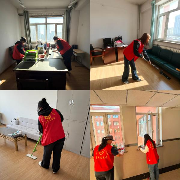 清扫过程中,志愿者们分工协作,不遗漏任何一个细节角落,大家耐心擦拭灰尘,认真清扫地面垃圾、杂物,细致整理文件、资料,对平日里难以清理的桌底缝隙、墙角拐角、储物柜后方等区域进行深度清洁。