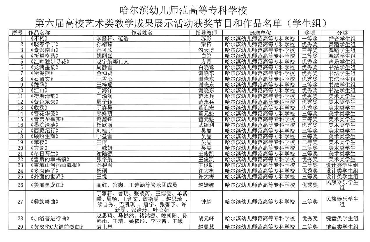 近日,黑龙江省文化和旅游厅发布《关于印发黑龙江省第六届高校艺术类教学成果展示活动获奖节目和作品名单的通知》,艺术学院在此次教学成果展示活动中,凭借优秀的作品与师生们不懈的努力,共斩获31项奖项荣誉,其中,二等奖4项,三等奖12项,优秀奖15项,为学院与学校赢得了新的荣誉!