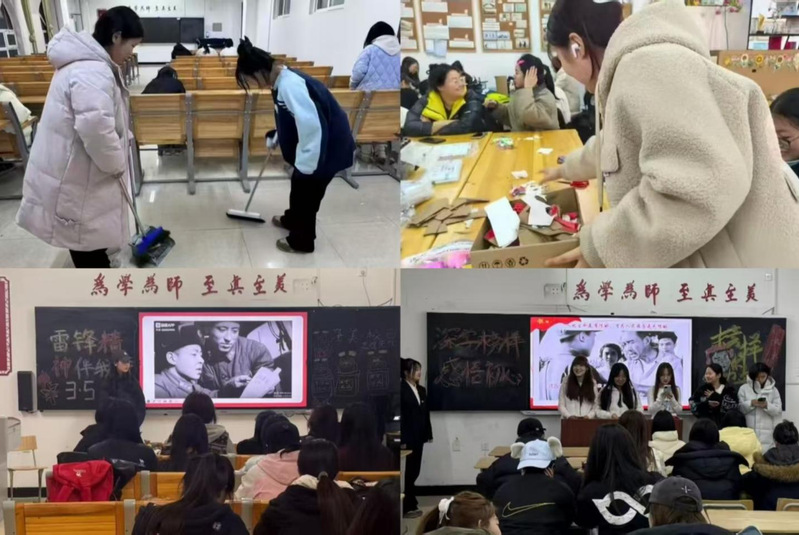 学前教育学院团总支组织各团支部开展系列志愿活动,立足校园开展教室等区域精细化清扫,打造净美校园,将劳动实践与思想教育有效结合;通过观影、研讨、诵读雷锋日记等形式开展主题团日,同学们结合幼教专业畅谈新时代“螺丝钉”精神,深化专业认同感。