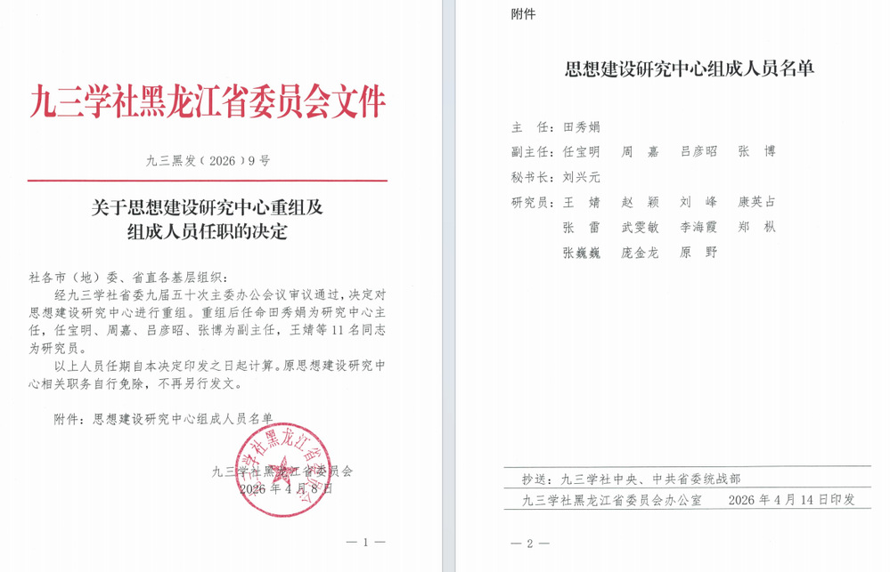 近日,九三学社黑龙江省委公布思想建设研究中心重组任职名单,我校九三学社哈幼专支社郑枞同志受聘为研究员。此次重组是社省委强化参政党思想引领、提升统战理论研究水平的重要举措,研究中心是全省统战理论与思想建设的核心智库。此次入选,既是对九三学社哈幼专支社履职成效与建设成果的充分认可,更是学校统战工作高质量推进的重要标志性成果。