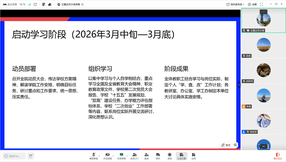 一是启动学习阶段(3月中旬—3月底),以集中学习与个人自学结合,深入学习教育政策、学校规划、“双高”建设与评估指标等内容,全体教职工制定个人“学、查、改”工作计划,各教研室、部门制定专项实施安排;