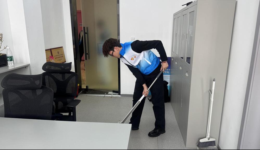志愿者们仔细擦拭课桌椅表面污渍与灰尘,规整摆放教学器材,对地面碎屑、角落积尘等卫生死角进行重点清扫。如图中志愿者正认真拖地,不放过任何一处细节,经过细致清扫,实训室变得窗明几净、井然有序,为师生营造了干净、舒适、安全的教学与学习环境,切实保障了实训活动的顺利开展。