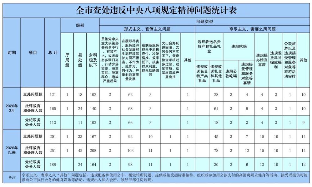 2026年2月,全市纪检监察机关共查处违反中央八项规定精神问题121起,批评教育和处理165人,其中党纪政务处分113人。