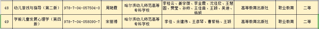 近日,黑龙江省教育厅发布《关于第二届省教材建设奖优秀教材推荐(认定)名单的公示》,拟认定第二届黑龙江省教材建设奖优秀教材(职业教育与继续教育类)86种教材,我校共有四部教材获省级优秀教材奖。其中《美术与幼儿美术创作》获优秀教材一等奖,《幼儿游戏与指导》《学前儿童发展心理学》《婴幼儿心理发展与教育》获优秀教材二等奖。这一成果的取得,标志着我校“三教”改革的进一步深化,教材建设质量提升不断取得新的突破。