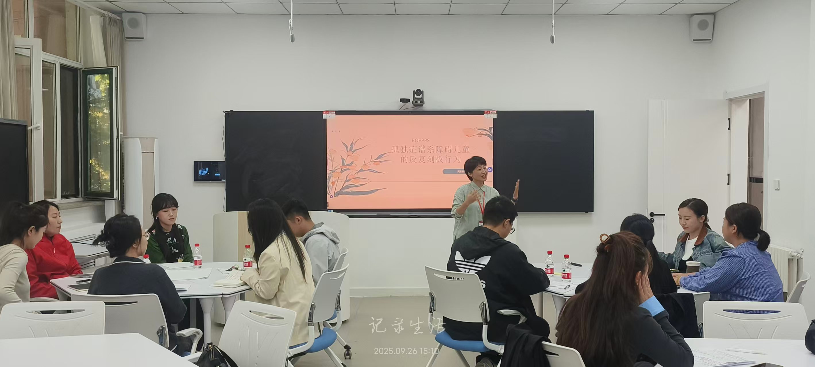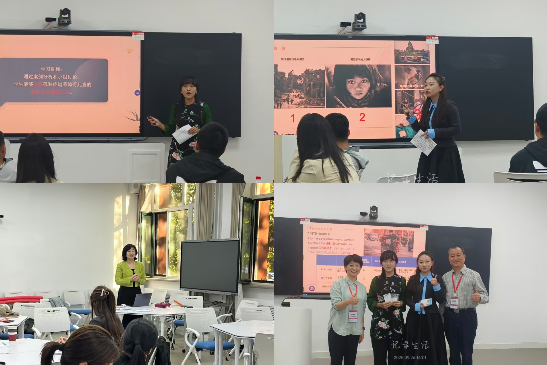 经过演练、优化后,26日下午进行了学习成果展示。两个小组结合前期打磨经验,各推选出一名教师代表:学前教育学院的周鹏雁老师,以《孤独症谱系障碍儿童的反复刻板行为》为主题,聚焦特殊教育领域的教学重难点;通识学院的齐悦涵老师则围绕新闻摄影三种类型,带来了贴合专业实践的精彩教学展示,两位教师充分展现了三天来的学习演练成果与各专业教学特色。展示环节结束后,张老师对两位教师的表现给予高度肯定,点赞她们将BOPPPS模型与学科教学深度融合的巧思——如周鹏雁老师对特殊教育案例的准确选择让模型与教学重难点适配,齐悦涵老师围绕专业特点生动展现模型与实践操作的结合,认可她们在课堂节奏把控与互动设计上的成熟度。现场参与教师也围绕“教学目标达成度”“前测案例适配度”等方面进行积极交流,在肯定亮点的同时也从教学目标、环节衔接、内容逻辑、参与方式等细节,提出优化建议,形成了互学互鉴、共同提升的良好研讨氛围。