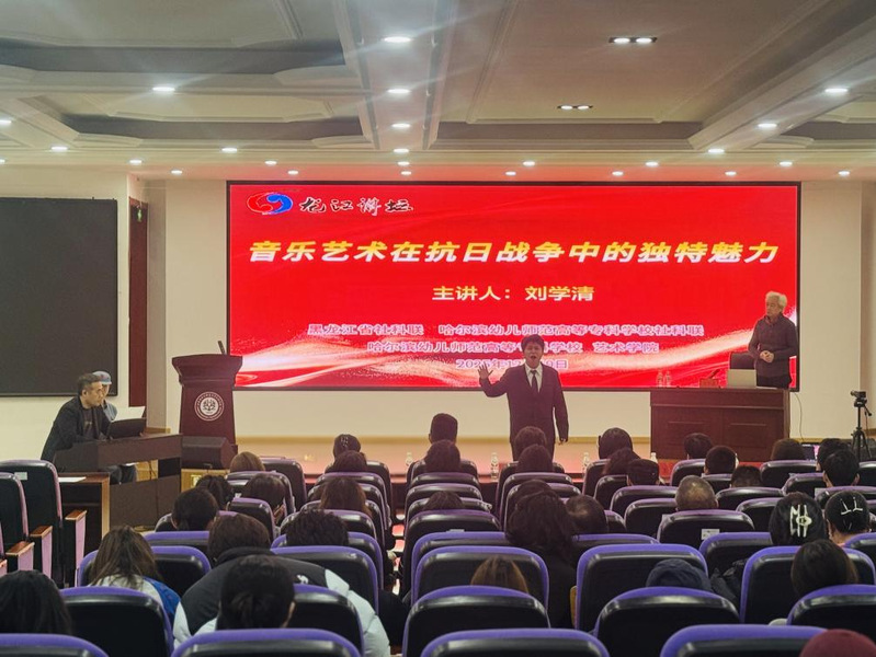 为纪念抗日战争胜利80周年,传承红色文化与艺术精神,12月19日,龙江讲坛第869期“红色文化·经典传承”系列讲座在哈尔滨幼儿师范高等专科学校举行。本次讲座由黑龙江省社科联、哈尔滨幼儿师范高等专科学校社科联主办,校艺术学院承办,特邀黑龙江省艺术研究院教授、国家一级演奏员刘学清作题为《音乐艺术在抗日战争中的独特魅力》的专题分享。