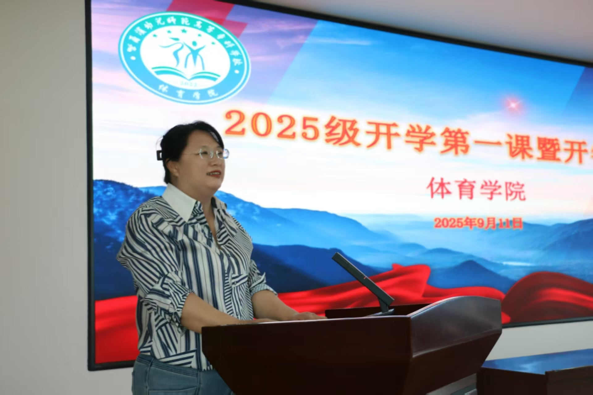 丁丽主讲“开学第一课”。丁丽围绕“就业实习”“竞赛实践”“文化创新”三大主题展开讲授。通过详实的数据和典型案例,介绍了学院实习合作平台与就业导向培养模式,强调“以实践促学习、以就业导规划”;在竞赛方面,鼓励同学们积极投身各类体育赛事,在实践中锤炼专业技能;谈及文化创新,院长强调“体育不仅是竞技,更是文化和精神的传承”,期望同学们融合创新思维,拓展体育的多元价值。