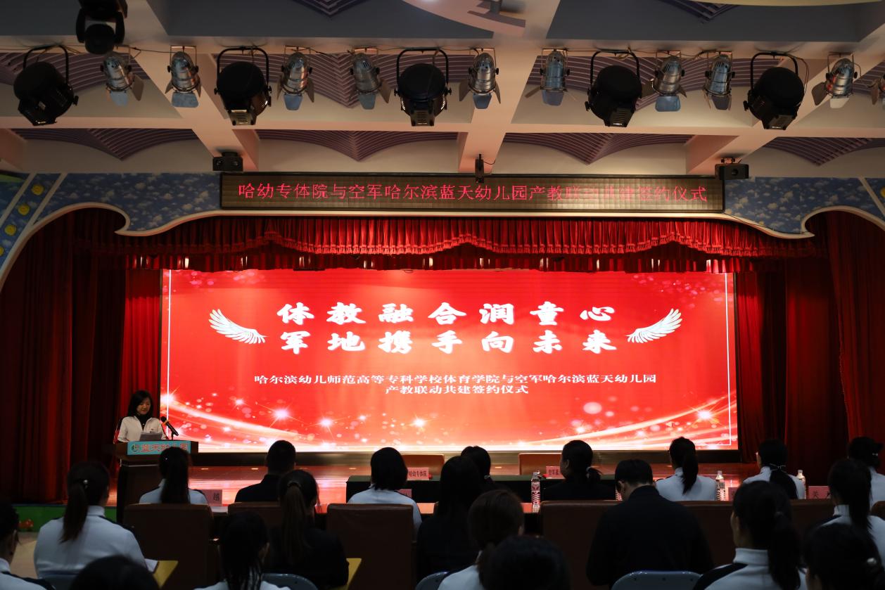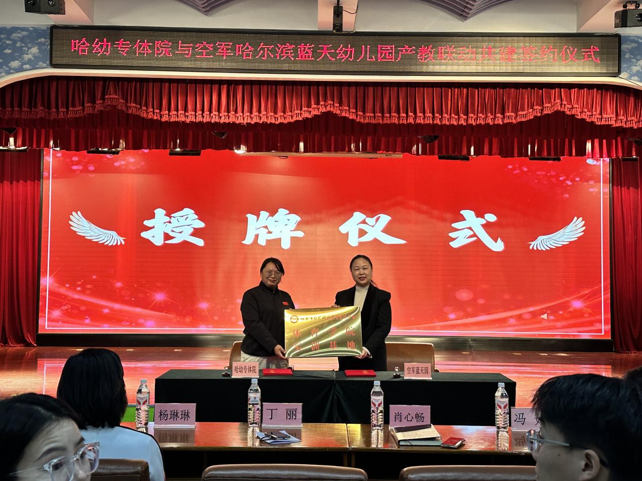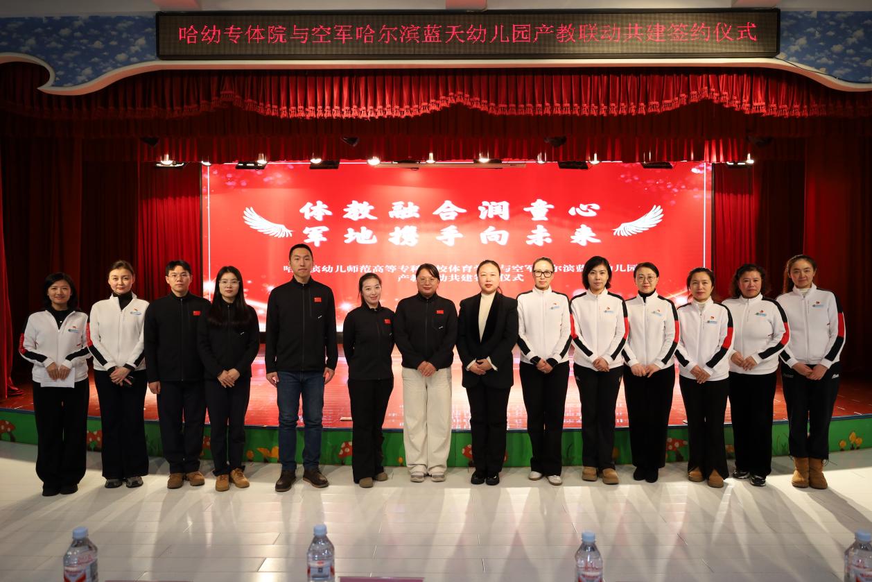 冬日暖阳映初心,校地携手启新程。12月19日下午,我校体育学院与空军哈尔滨蓝天幼儿园产教融合共建签约仪式在蓝天幼儿园举行。体育学院院长丁丽,学院办公室主任刘元凯,幼儿体适能任课教师马艾琳、杜荣华、史梦慧,幼儿园园长肖心畅及幼儿园骨干教师共同出席了仪式,一同见证这一响应国家“体教融合”战略、推动学前教育高质量发展的时刻。
