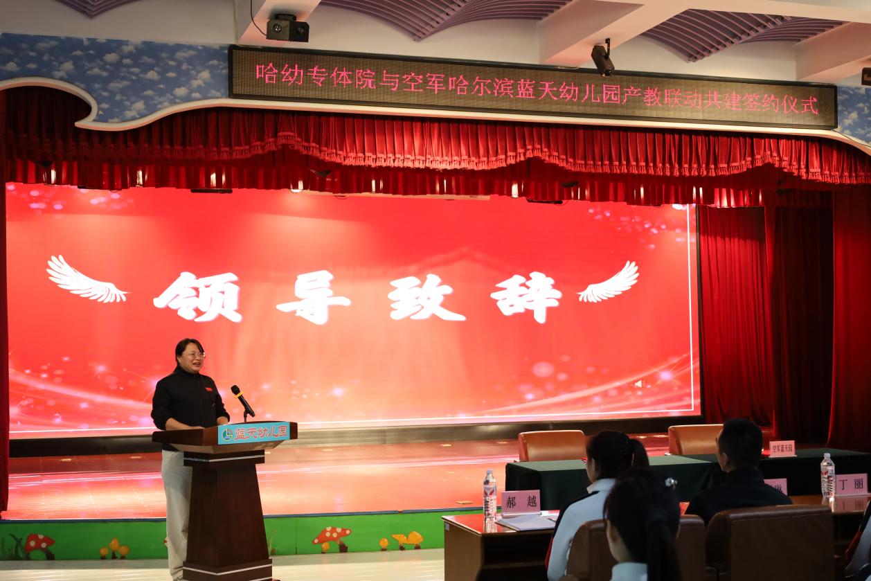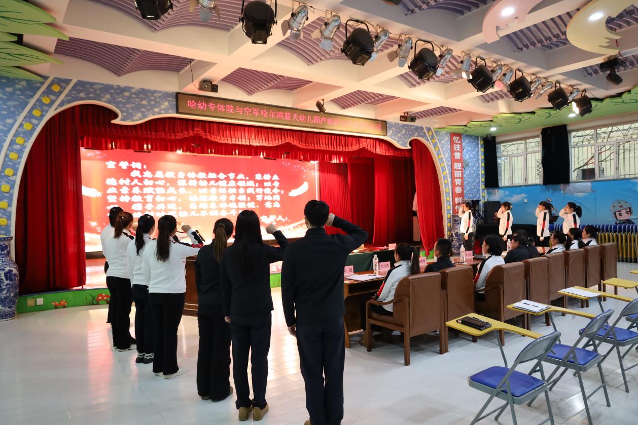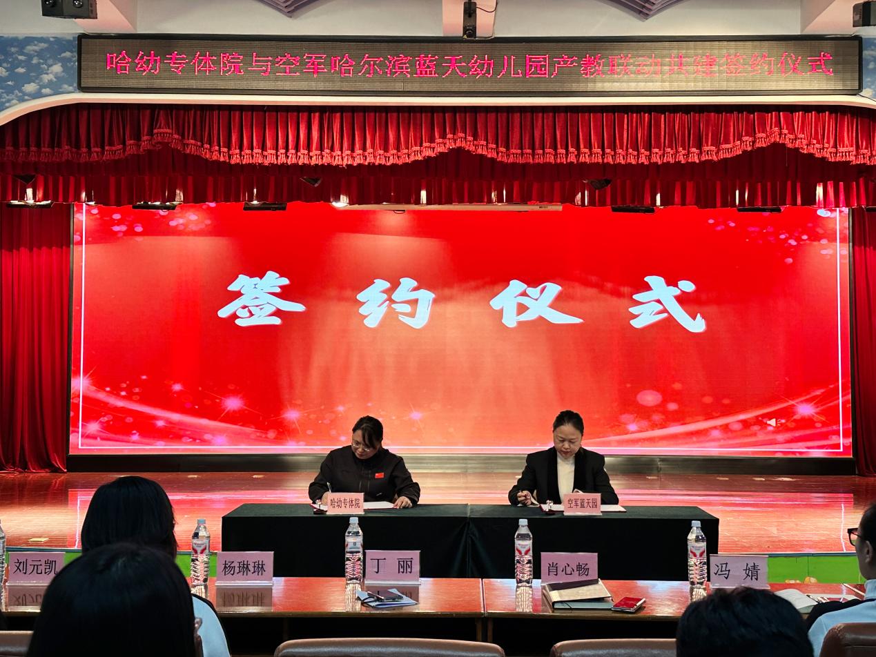 冬日暖阳映初心,校地携手启新程。12月19日下午,我校体育学院与空军哈尔滨蓝天幼儿园产教融合共建签约仪式在蓝天幼儿园举行。体育学院院长丁丽,学院办公室主任刘元凯,幼儿体适能任课教师马艾琳、杜荣华、史梦慧,幼儿园园长肖心畅及幼儿园骨干教师共同出席了仪式,一同见证这一响应国家“体教融合”战略、推动学前教育高质量发展的时刻。