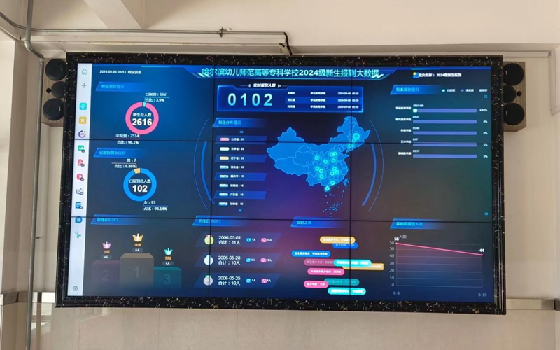 主楼大厅的LED屏幕以大数据形式直播当天的报到进度,实时报到人数、院部报到进度一览、各省份已报到比例等信息一目了然,“数智迎新”为本次迎新活动锦上添花。
