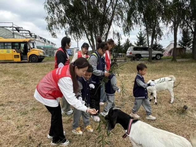 采摘后,丰收乐趣延伸至牧场。志愿者教孩子“掰草轻喂”,讲解“喂羊助其长大,也是丰收的一部分”,再指导投喂。孩子看羊咀嚼时惊叹不已,轻摸羊毛。志愿者强调“喂羊是丰收劳动,照顾生命要尽责”,传递 “劳动伴责任” 意识,牧场满是温馨。