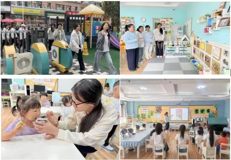 随后,学生们进入各班级开展沉浸式见习。从庄严的升旗仪式到温馨的生活环节,从集体教学到自主游戏,同学们细致观察教师如何以儿童为中心实施教育,认真记录保教细节,并在带教教师的指导下积极参与幼儿互动,体验“爱心、耐心、细心”在实际工作中的真实体现。