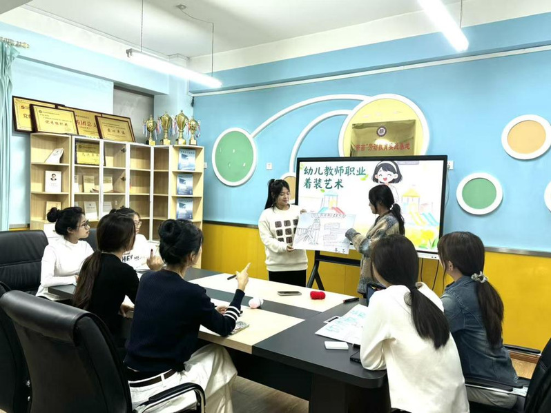 活动开始,主持人围绕幼儿教师着装的职业性、实用性等核心要点进行讲解,为同学们明确讨论及创作方向。随后,各组围绕“幼师职业穿搭”展开热烈交流,通过手绘形式将搭配创意呈现出来。