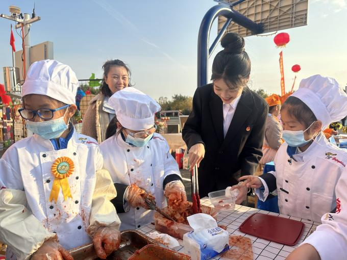 活动以“党建引领、以劳践学、服务师生”为核心,学生们充分发挥先锋带头作用,提前深入研学传统美食制作技艺,明确食材处理、调料配比、火候把控等实操关键要点。在腌泡菜环节,耐心指导小朋友完成蔬菜清洗、简单切分等安全操作;在煎豆包环节,小朋友们在学生助教的帮助下,完成豆包摆放、小火慢煎、翻面观察等安全操作,尽情感受烹饪的乐趣。作为未来的幼教工作者,学生们在服务型劳动中践行“做中学、学中教”理念。活动尾声,大家将封装好的泡菜与热乎的煎豆包分享给师生,用亲手制作的美食传递劳动温情。