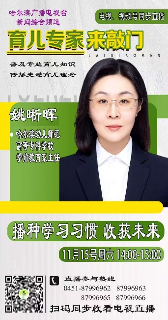 11月15日下午,我院学前教育系姚晰晖老师受邀,参加哈尔滨市电视台新闻综合频道《育儿专家来敲门》的直播栏目,以“播种学习习惯,收获未来”为中心话题,结合学前教育专业知识与一线实践经验,为电视机前和线上的家长带来科学育儿干货分享,赢得了栏目和观众的好评。