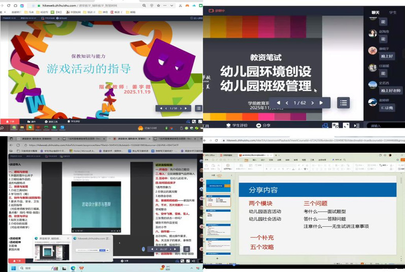 为切实助力2023 级学前教育系和早期教育系学生夯实教资备考基础、掌握科学应试技巧,提升教师资格证考试通过率,学前教育系于11月10-20日精心组织开展教师资格证考试专项辅导讲座,活动通过智慧树线上平台有序开展,以精准辅导,为学生备考之路保驾护航。