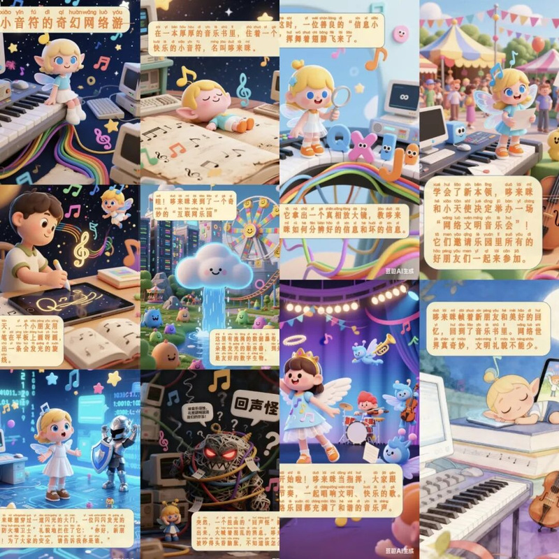 本次比赛的优秀作品聚焦“网络正能量”与“童心教育”两大核心,在AI技术运用与教育内涵表达上亮点突出。24级李宇奥同学与25级唐曼嘉的AI海报,以暖色调插画风格呈现“幼儿通过安全网络学习知识”的场景,用细节传递“健康用网、快乐成长”的理念;25级吴爽同学的绘本故事,借助AI绘制的连贯画面,讲述小音符在网络世界中辨别信息、帮助同伴的故事,既展现了出色的叙事能力,又融入了幼儿网络安全教育的知识点。