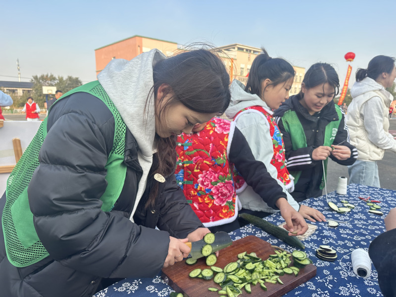 活动以“实践教学+互助协作”为核心,学子以“助教+伙伴”的双重身份,为小朋友提供沉浸式生活劳动技能服务。活动现场,学子们先带领小朋友共同完成黄瓜清洗,随后细致讲解“安全握刀、均匀切片”的核心技巧并手把手示范,再引导大家将瓜片串制后整齐摆放晾晒。全程以“边教边做、边学边干”的互动模式,让学子在技能输出中深化专业认知,小朋友在亲身实践中掌握基础劳动本领,既实现了生活技能的温情传递,更彰显了服务性劳动的互助价值。