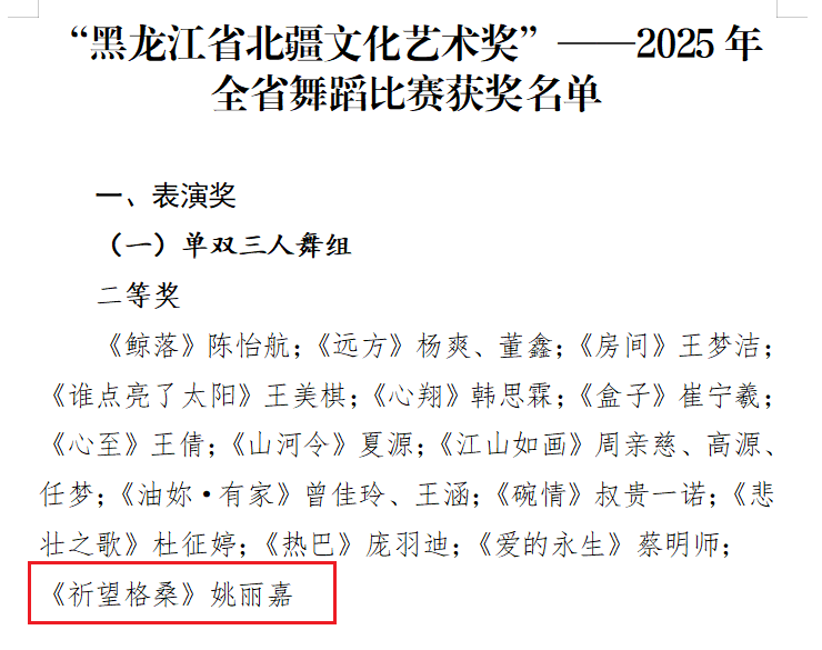 12月12日,黑龙江省文化和旅游厅正式公示“黑龙江省北疆文化艺术奖”——2025年全省舞蹈比赛获奖名单。作为经黑龙江省委、省政府批准设立的省级专业艺术奖项,该赛事集权威性、专业性与高规格于一体,是展示全省舞蹈艺术创作丰硕成果、推动优秀舞蹈作品与人才涌现、促进全省舞蹈事业繁荣发展的重要平台。赛事吸引了全省各级专业院团、艺术类高校、群众艺术馆等单位的优秀舞蹈从业者同台竞技,竞争尤为激烈。