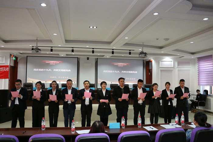 两支队伍的辩手激情澎湃、踊跃辩驳、唇枪舌战、妙语连珠。最终2017级段潇舒辅导员所带领的正方代表队,以及2016级辅导员王磊辅导员所带领的反方代表队获得胜利。在评委打分期间,学生党支部积极分子上演了小品《文明出行,人人有责》,学生处党支部党员朗诵了《同庆党的十九大,共树文明新风尚》,活跃了氛围。