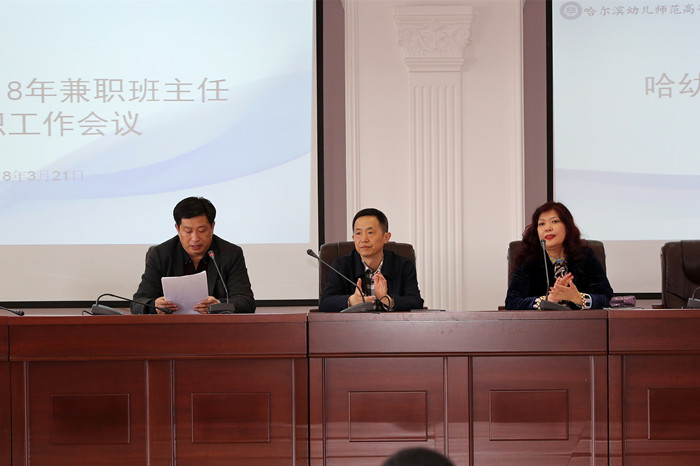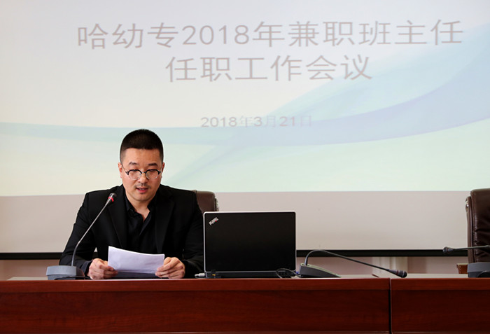 会上,学生处处长周杰宣读了《哈幼专兼职班主任工作职责实施细则》,并指出了兼职班主任对学生思想政治教育与管理,特别是学风建设方面的作用。学生处副处长孙晓达宣读了兼职班主任名单,并将其带班情况予以公布。兼职班主任王春龙作了发言,围绕如何培养“爱业”、“敬业”、“守业”的精神谈了自己的教育构想。辅导员代表范雪阳作了发言,表示会与兼职班主任一道,努力做好学生工作。