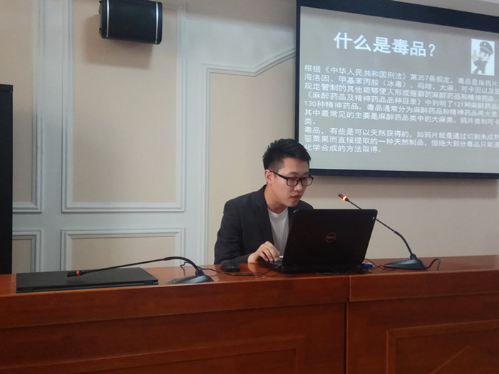 讲座共分为什么是毒品(毒品的定义)、常见毒品的种类和特征、毒品的危害(毒品给自身带来的危害、毒品给社会带来的危害)、如何防范毒品的侵害以及吸毒和贩毒的处罚办法五个部分。许老师在讲座中通过法律知识解读、吸毒、贩毒案例解析等形式,对上述内容进行了详细阐释,他指出禁毒工作关系国家安危、民族兴衰、人民福祉,厉行禁毒是党和政府的一贯立场和坚决主张,大学生是中国特色社会主义事业的未来,要清楚的认识到毒品的危害,拒绝诱惑、远离毒品、珍爱生命。