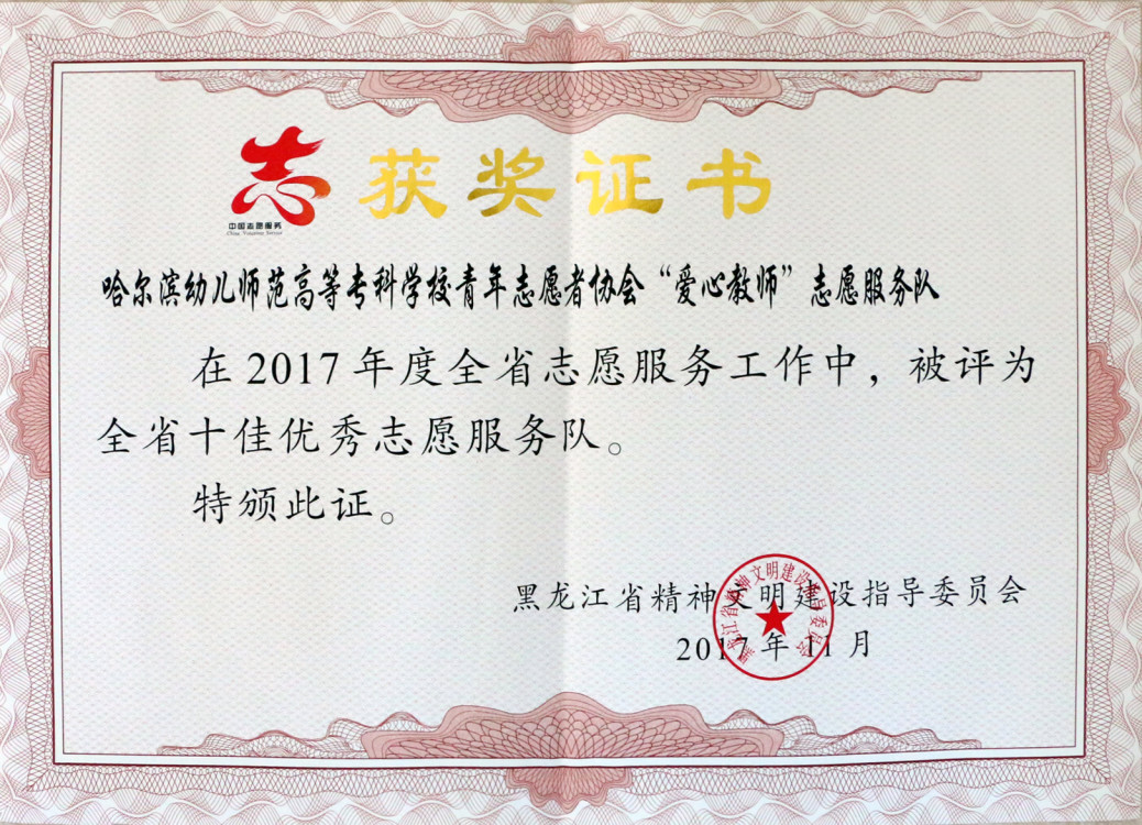 哈尔滨幼儿师范高等专科学校青年志愿者协会“爱心教师”志愿服务队在所有队员的共同努力下,志愿服务不断被认可,喜讯传来——“爱心教师”志愿服务队被黑龙江省精神文明建设指导委员会评为“2017年度全省十佳优秀志愿服务队”。