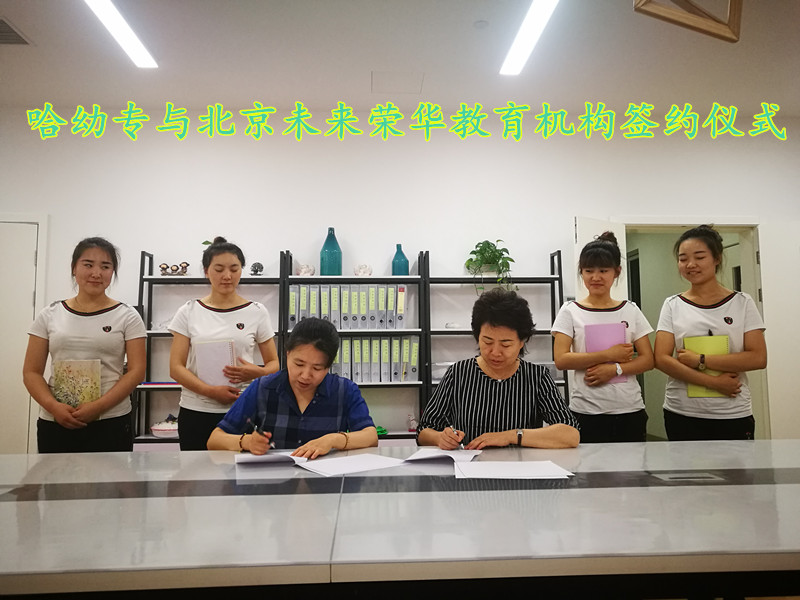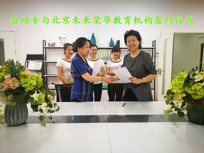 2018年5月27日上午十时,哈尔滨幼儿师范高等专科学校党委副书记、校长陈爱华与北京未来荣华幼儿教育科技有限公司负责人宋红梅园长在北京未来荣华金嵿幼儿园正式签署了《哈尔滨幼儿师范高等专科学校校企合作协议书》。