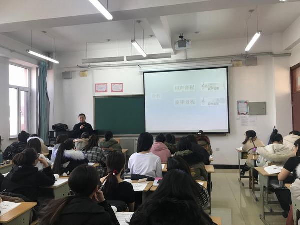 赵宇老师公开课的内容是《音程的构成与识别》,课程内容量大、难度较高。音程是构成和表现音乐的基础,每一条旋律、每一个和声,都是由音程构建的。只有学习了音程才能初步了解乐音的组合方式和表现形式,进一步理解音乐的真正内涵。学习音程,首先要掌握音程的构成与识别,赵宇老师以自己多年的教学经验,总结出一套快速识别音程的教学方法,通过赵宇老师耐心的讲解及多种练习相结合,学生们都良好的掌握了音程的识别方法,教学成果显著,课堂气氛活跃。