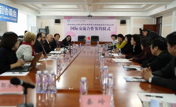 11月29日下午,美国塞基诺谷州立大学代表团访问了哈尔滨幼儿师范高等专科学校。学校党委书记孙杰、校长陈爱华同志接待了代表团一行。