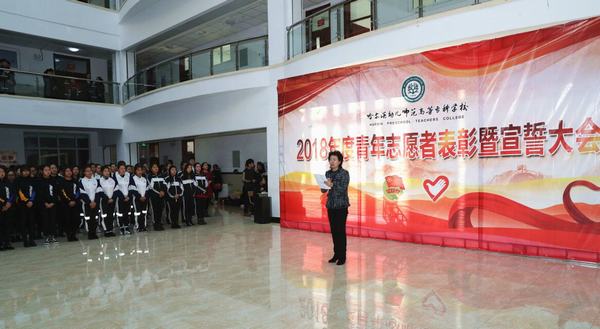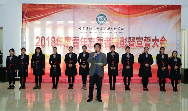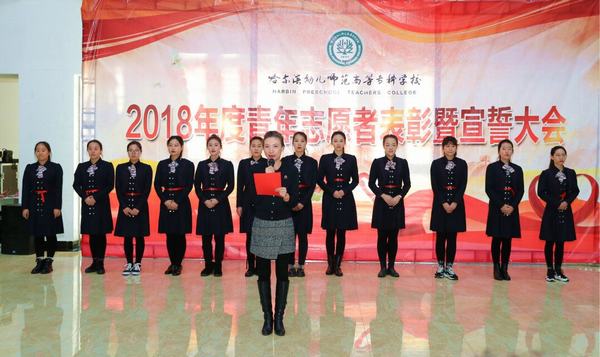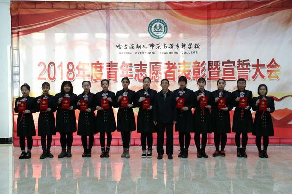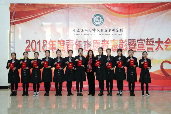 哈尔滨幼儿师范高等专科学校青年志愿者协会自2009年成立以来,在学校党委和领导班子的关注下,在校团委的领导下,现已发展成为全员注册,全员服务的志愿服务组织。87支志愿者服务队,4000名志愿者的足迹近年来,也由学校走向了社区,走向社会,走进留守儿童的心里,走到孤寡老人身边。近年来,我校志愿服务活动受到了社会各界的认可和赞许。其中“爱心教师”志愿服务队被评为“黑龙省优秀志愿服务组织”、“全省十佳志愿服务队”;共青团义务星期六”志愿服务队被评为“哈尔滨市优秀志愿服务集体”;“悦享图书”志愿服务队被评为哈尔滨市图书馆评为“2018年度优秀志愿服务组织”。我校青年志愿者协会更是多次被评为“哈尔滨国际马拉松志愿者服务优秀组织单位”。在此次表彰大会上,对过去一年优秀青志愿者和服务队进行表彰。优秀青年志愿者就像一面旗帜引领我们前进,青年志愿者服务队队长、优秀青年志愿标兵代表上台与大家交流经验与心得,2018级新青年志愿者代表带领18级全体志愿者一起高举右臂,面对团旗,郑重许下铮铮誓言。这一刻我们加入了青年志愿者的队伍里,让世界充满了爱。