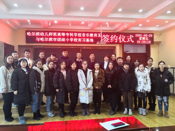 会议最后,双方签署了关于《哈尔滨幼儿师范高等专科学校音乐教育系与团结小学校实习基地的协议》,随后举行了音乐教育专业实习基地授牌仪式。最后所有参会人员共同合影留念。