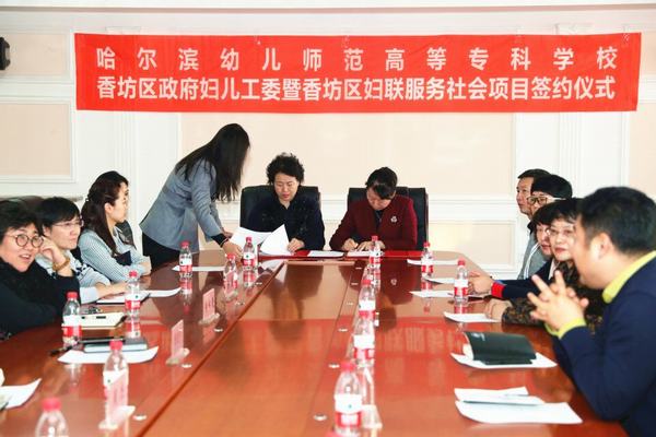 为实现国家关于高等职业教育服务经济社会发展的要求,推动高职院校为社会提供多样化的教育形式,促进学校美育和社会家庭美育紧密联系。哈尔滨幼儿师范高等专科学校与香坊区政府妇儿工委暨香坊区妇联拟开展教学专业能力服务培训,于2018年12月24日下午在主楼832举行哈尔滨幼儿师范高等专科学校与香坊区政府妇儿工委暨香坊区妇联服务社会项目签约仪式。