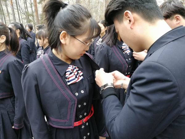 学生代表首先给革命烈士扫墓,全体默哀1分钟,表达自己哀思。老团员为新团员佩戴团徽颁发团证和团章。31名新团员在烈士墓前,面对团旗进行了庄严的宣誓,随后团委王希老师为新团员宣读《团章》中团员的权利和义务的条款,新老团员代表发言表示自己一定承担一名团员该承担的责任,为更多的同学起到模范带头作用,并以此为荣,带动其他积极要求进步的同学共同进步。最后团委副书记刘波老师讲话希望大家时刻牢记自己共青团员的身份,用自己的实际行动表明自己无愧于“团员”这个光荣的称号,让闪闪的团徽指引我们奋勇前进!