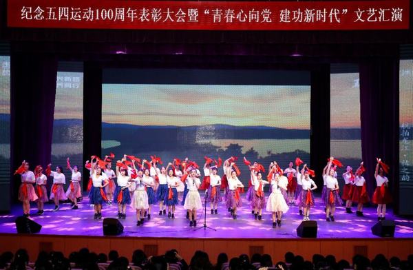 为庆祝中华人民共和国成立70周年、五四运动100周年,贯彻习近平总书记在中共中央政治局第十四次集体学习时的重要讲话精神,激励和引领广大青年牢记五四历史、加强五四研究、传承五四精神,坚定“四个自信”,矢志投身新时代夺取中国特色社会主义伟大胜利的新征程。校团委于4月24日下午,在剧场举行了纪念五四运动100周年表彰大会暨“青春心向党 建功新时代”文艺汇演。