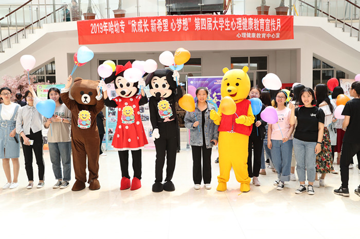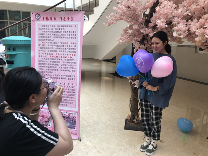 活动过程中,还将”最美微笑照片征集活动”中选取出来的照片进行了展出,在照片展出的同时,也附带了它们背后的故事,将生活的美好带到了各位同学的面前;工作人员在现场穿着玩偶套装,发放印有心理健康标语的气球,通过简单直接的拥抱来带给同学温暖。